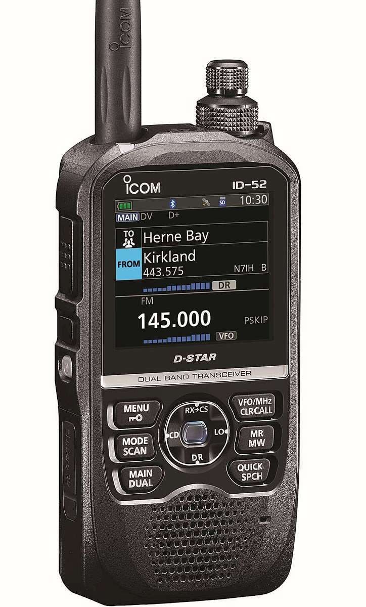 Oltre alle bande radioamatoriali 144-146 e 430-440 MHz, il ricevitore supporta anche la banda di trasmissione WFM e le bande aeronautiche VHF e UHF con due ricevitori (dualwatch). La ricezione simultanea sulle bande V/U, U/U e V/V è possibile in tutte le combinazioni. Anche due segnali DV possono essere ricevuti e decodificati simultaneamente! La dotazione standard dell’ID-52E con Bluetooth garantisce la possibilità di utilizzare cuffie e microfoni senza fili. Ma il controllo tramite app gratuita per Android è possibile anche via Bluetooth, ed è stata annunciata un’app per IOS.